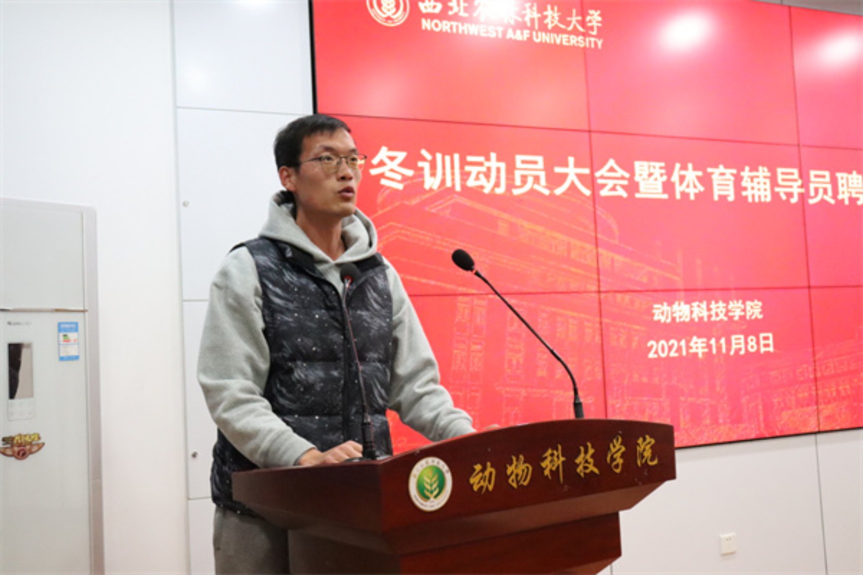 11月8日下午,学院在107会议室举行动物科技学院2021年冬训动员大会暨动科学院体育辅导员聘任仪式。学院党委副书记王力,体育辅导员陈艳、冯鑫,全体专兼职辅导员及参与冬训的学生代表参加会议。辅导员冯来顺主持会议。