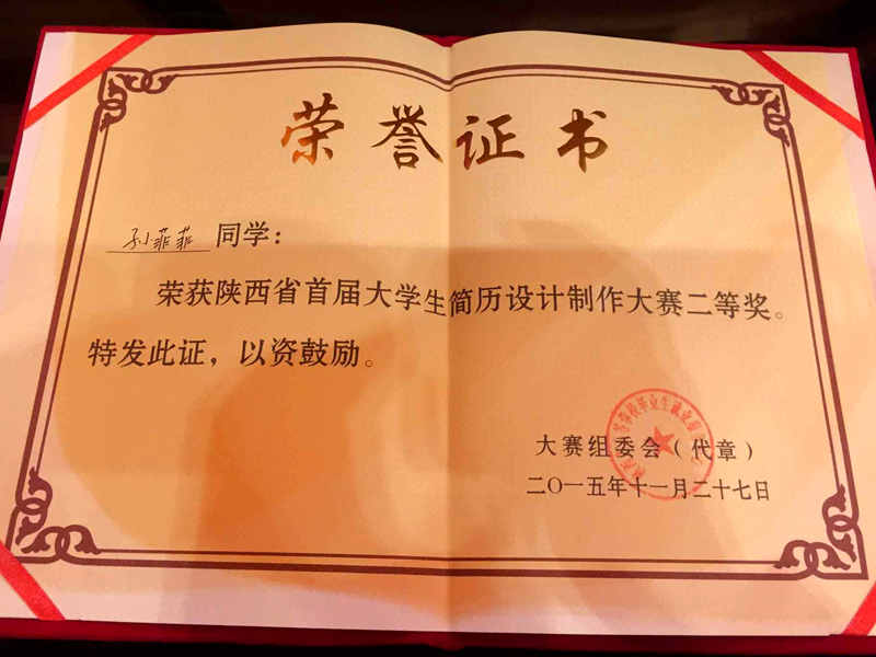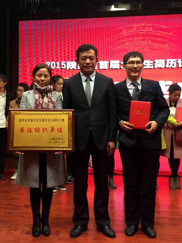 陕西省首届大学生简历设计制作大赛由陕西省教育厅、陕西省高等学校毕业生就业服务中心等单位联合举办,大赛自10月中旬开始,历时一个多月,共有来自全省59所高校的1751名毕业生参加比赛,经过初赛、复赛、网上决赛等环节,最终来自13所高校的15名选手进入现场总决赛环节,总决赛选手通过现场展示VCR,陈述自己简历,最后由评委和用人单位进行提问,并现场点评和打分,评出奖项。本次大赛中我校获得最佳组织单位奖,孙菲菲简历指导教师白金凤老师获得优秀指导教师奖。