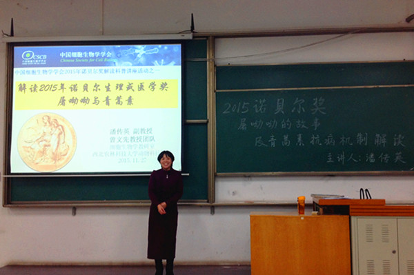 为丰富我院本科新生的科学文化知识,提升科学素养,弘扬科学知识,传播科学思想。11月27日,曾文先教授团队骨干成员、硕士研究生导师潘传英副教授在北校区8T02阶梯教室为我院240余名2015级本科生做了一场题为“解读2015年诺贝尔生理医学奖:屠呦呦与青蒿素”的精彩讲座。此次讲座系中国细胞生物学学会“2015年诺贝尔奖解读科普系列讲座”,学院本科生、研究生200余人参加了本次讲座。