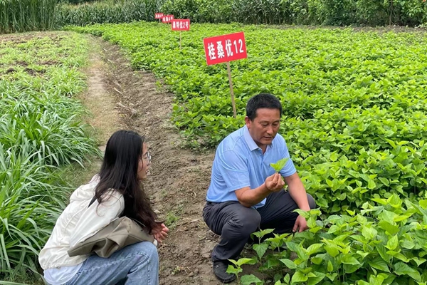 蚕桑技术指导老师为调研人员介绍新桑品种