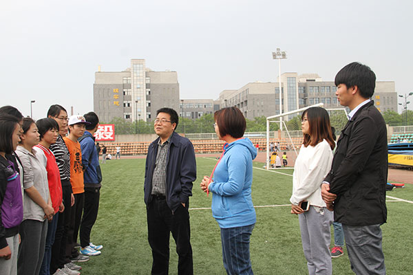 4月19日下午,学院党委书记赵延安、党委副书记王晓娟及全体专兼职辅导员来到北校区田径场慰问为备战校运会的春训运动员及方阵训练人员。