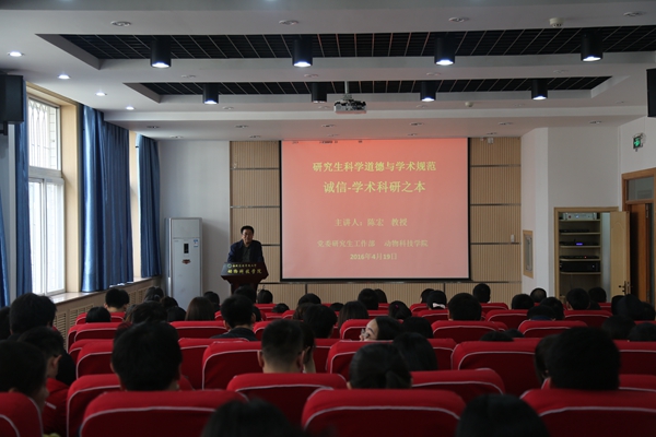 研究生学术诚信问题关系到研究生教育的质量和创新型人才的培养,意义重大。为了进一步加强研究生学术道德建设,防范研究生学术失范行为发生,培养研究生学术诚信品质,提升研究生学术道德素养,4月19日上午,由校党委研工部主办,我院承办的第二期“研究生科学道德与学术规范”宣讲活动在我院107会议室如期举行。主讲人陈宏教授以“诚信—学术科研之本”为题,结合自己35年来从事科研工作的经历、感悟和实例,对在场的150余名研究生进行了学术诚信教育。报告会由赵延安书记主持。