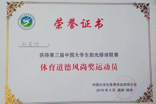 5月9-18日,第三届“中国大学生阳光排球联赛”在福建漳州女排体训基地进行。我院草业科学121班刘芮伶、草业科学122班卡斯木·亚库普代表学校参加比赛,最终我校女子排球队获得第二名,男子排球队获得第三名。同时我院刘芮伶同学荣获“优秀运动员”、“体育道德风尚奖运动员”等荣誉称号。